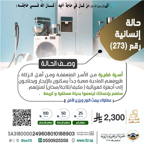 أسرة فقيرة من الأسر المتعففة ومن أهل الزكاة ، ظروفهم المادية صعبة جداً يسكنون بالإيجار ويحتاجون إلى أجهزة كهربائية ( مكيف/ثلاجة/سخان) لمنزلهم . ساهم بإحسانك لينعموا بحياة مستقرة و كريمة .